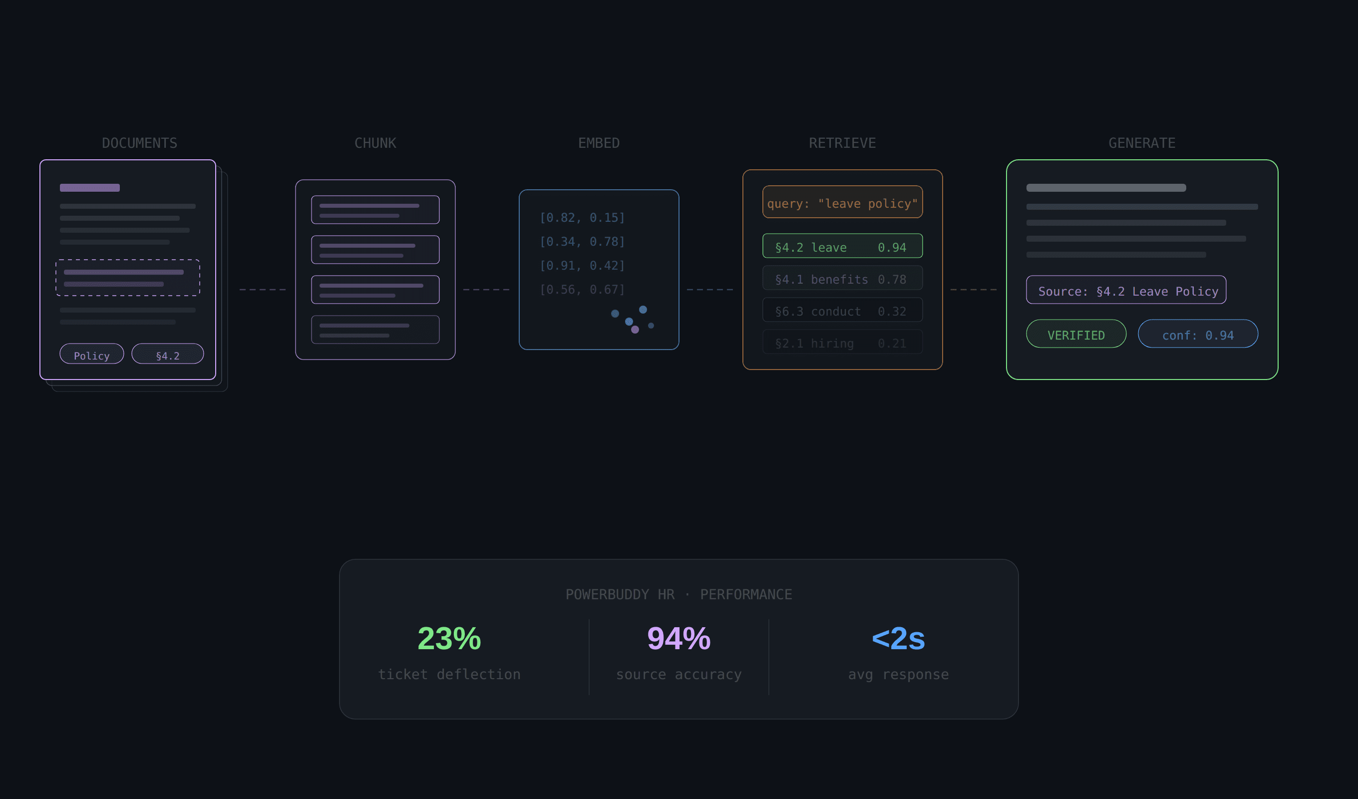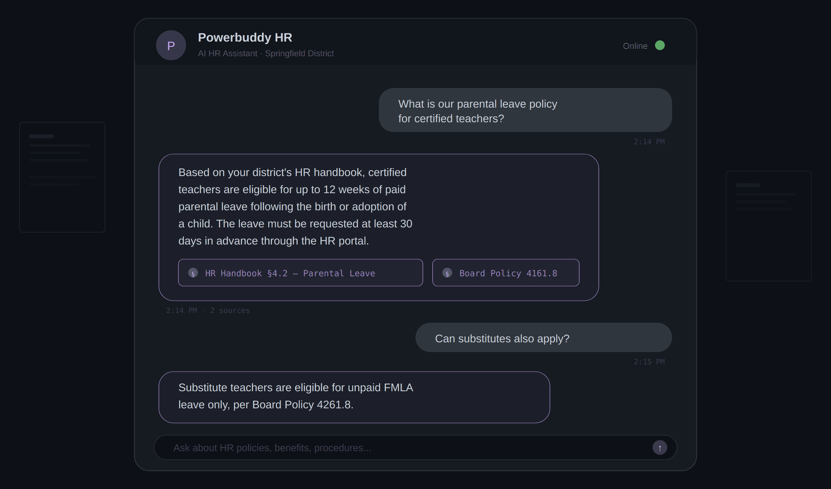 Verticalized PowerSchool's enterprise RAG engine (Powerbuddy) into a compliance-grade HR assistant for K-12 districts — delivering instant, source-attributed policy answers and deflecting 23% of Tier 1 support tickets.