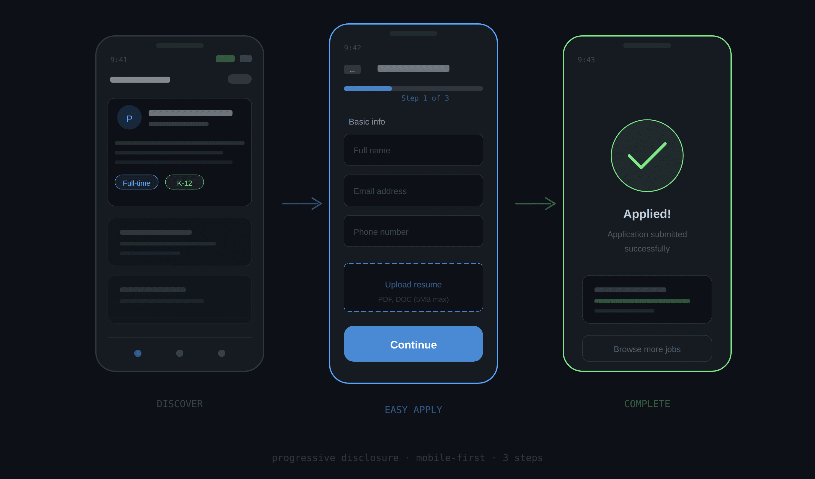 Identified a 60% mid-funnel drop-off on SchoolSpring's 800K+ MAU job board and led a full UX overhaul - shipping Easy Apply, progressive disclosure, and mobile-first redesign to more than double application completion rates.